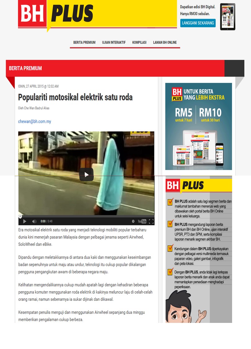 Era motosikal elektrik satu roda yang menjadi teknologi mobiliti popular terbaharu dunia kini menerjah pasaran Malaysia dengan pelbagai jenama seperti Airwheel, SoloWheel dan eBike.